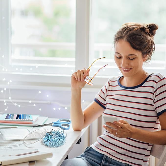 - 【Easy To Carry】 You can put these blue desk accessories in the drawer or desk at will, it won't take up too much space. The clips are equipped with a lattice storage box for easy organization use and storage. You can also put this school supplies set in your handbag or schoolbag and take them anywhere.