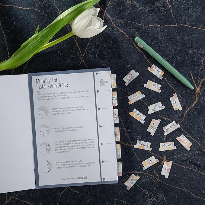 - 24 Tab Stickers: Great value set of tab stickers that includes 12 month tabs and 4 blank tabs so you can reference your own notes and organize your planner better.