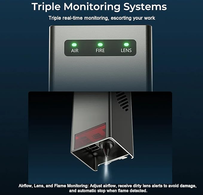 - 【Integrated Air Assist】Equipped with an air assist set on the laser engraver keep your arts with smooth lines,complete patterns and clean material surfaces, by quickly reduce the temperature of the material surface, preventing distortion and discoloration due to high temperatures, effectively blows away smoke and debris generated during laser engraving machine working ensures laser energy stability.