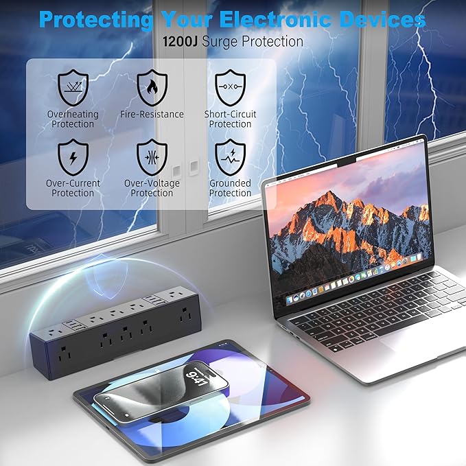 - 【1200J Surge Protection】-Made from fire-resistant ABS plastic, this desk plug station features a built-in circuit breaker for overload, short circuit, and overheat protection, effectively handling voltage spikes, protecting your computer and accessories.