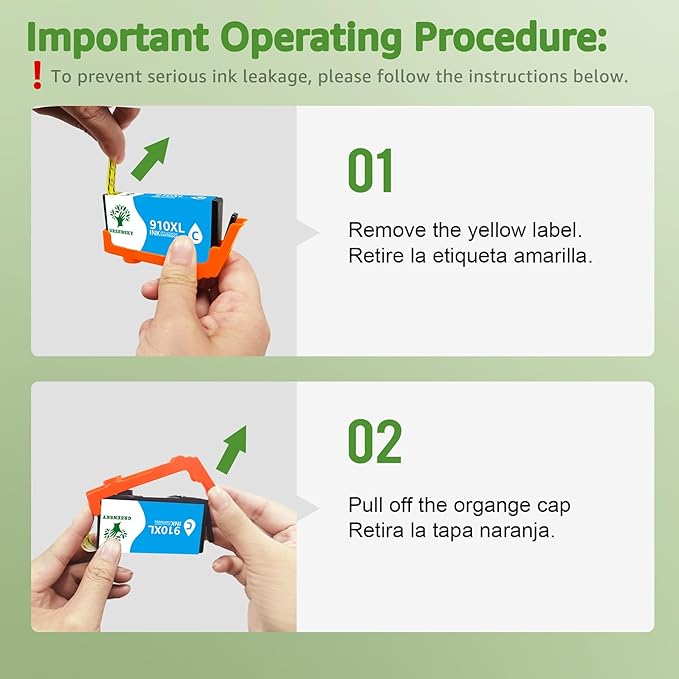 - Important Operating Procedure: To prevent serious ink leakage, please follow the instructions below. Start by peeling off the yellow label and then proceed to pull off the orange cap