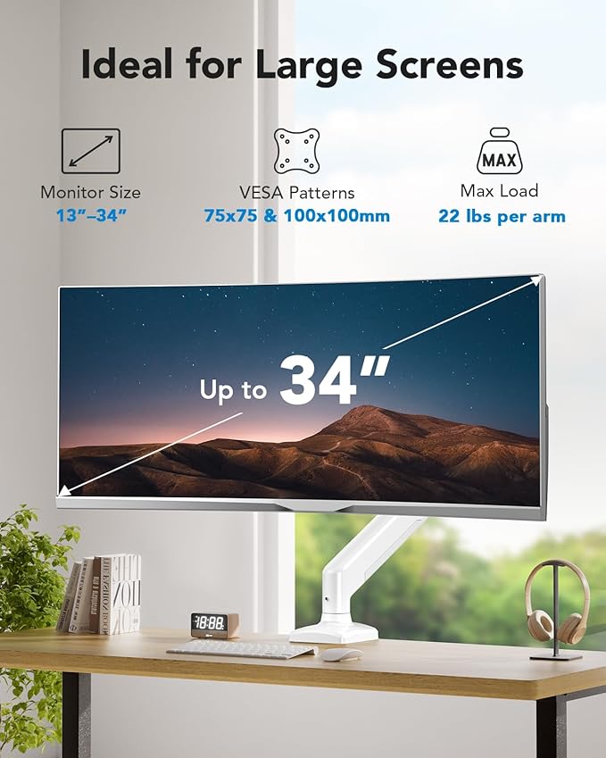 - Fits Large 34″ Screens: The computer single monitor stand is compatible with most 13″–34″ flat or curved screens with VESA mounting patterns 75x75 or 100x100mm. The wide size range allows you to mount most monitors above the desktop to free up valuable desktop space