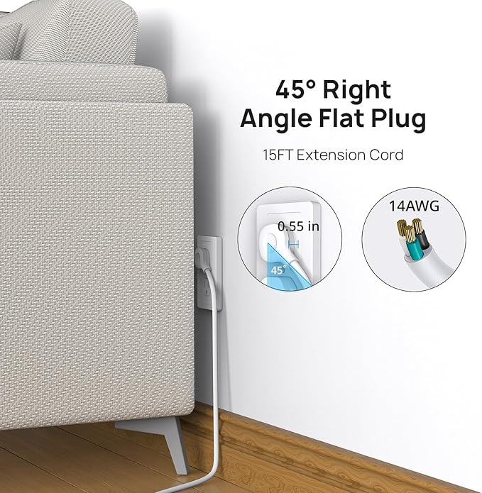 - 15ft Extension Cord Flat Plug: This surge protector is made of 14 AWG pure copper for extra durability, the 15ft extension cord is heavy duty and has better current carrying capacity (15a). The low profile right angle flat plug eliminates awkward cords from cluttering and doesnโt block the bottom receptacle
