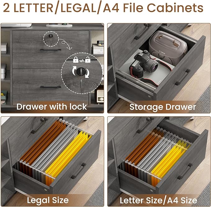 - 📁【What can you get?】 The file cabinet has 2 file drawers with 1 lock for Legal, Letter, A4 sizes standard file, power strip for charging 4 devices at the same time, spacious desktop large enough for printers and scanners, 6 storage shelves, 4 hooks and 4 industrial casters. Filing cabinet that can be combined with any computer desk to form an L-shaped office area.
