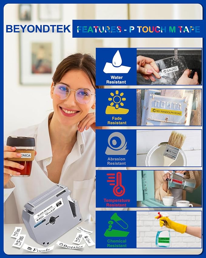 - 【P Touch M Tape Refill】: Indoor or outdoor labels,These Laminated label tapes are Water Resistant, Grime Resistant, Grease Resistant, Temperature Resistant, Abrasion Resistant, Chemical Resistant as well as Fading Resistant.