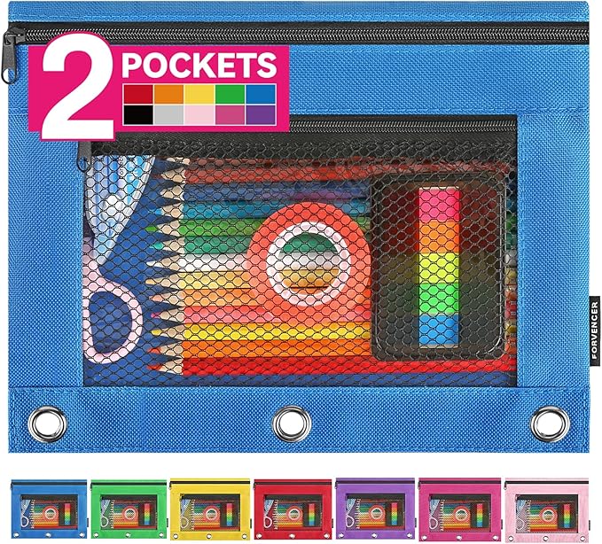 - Easier Sorting and Storage: Two zippered compartments make it easy to organize and store your supplies. It’s 3-hole-punched for easy binder attachment, with a mesh front pocket for smaller items like erasers and clips, and a larger pocket for pens, rulers, and other accessories.