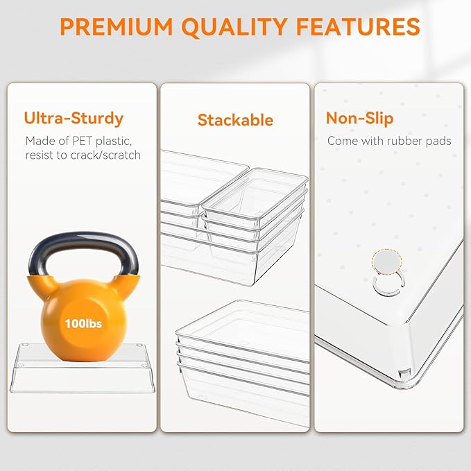 - 【FOOD-GRADE QUALITY】Crafted from premium PET plastic, our desk drawer organizers are twice as sturdy as other fragile ones, and resistant to cracks and scratches. No smells, and safe as food storage, refrigerator pantry organizer and storage. (If quality fails, we'll provide you with a new complete set.)