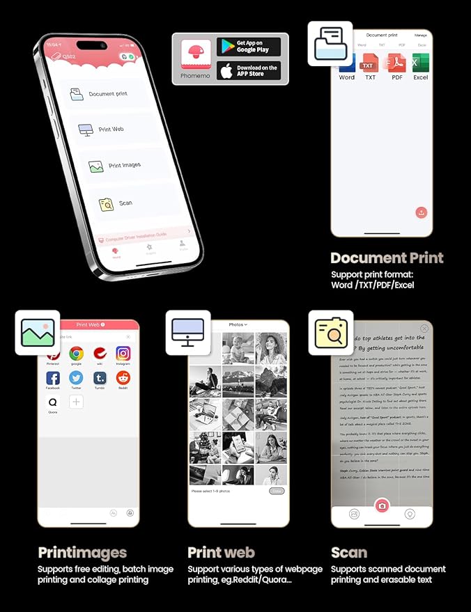 - 300dpi High-Quality Printing: Phomemo Q302 inkless printer have a print resolution of up to 300 dpi for crisp, clear prints. Text and graphics are clear and easy to read. High-quality printing enhances the professionalism of any document and impresses clients or business partners, because Q302 thermal printer ensures a consistent and appealing visual presentation. This portable wireless printer has the ability to print high-quality output with minimal smudging and fading