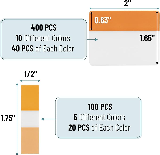 - Package includes 500 pieces of sticky tabs in 21 sets, 400 pieces of 2-inch tabs in 20 sets with 10 different colors, and 100 pieces of 0.5-inch tabs in 1 set with 20 pieces of each color.