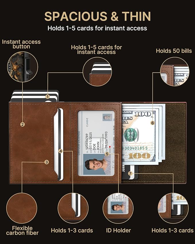 - 【QUICKEST ACCESS】Instant card access at the tap of a button by a single hand. Stores 10-15 cards and 15 bills total. The pop-up aluminum card holder stores 6-7, the built-in cash slot stores 50+ bills, and the ID window for driver's licenses.