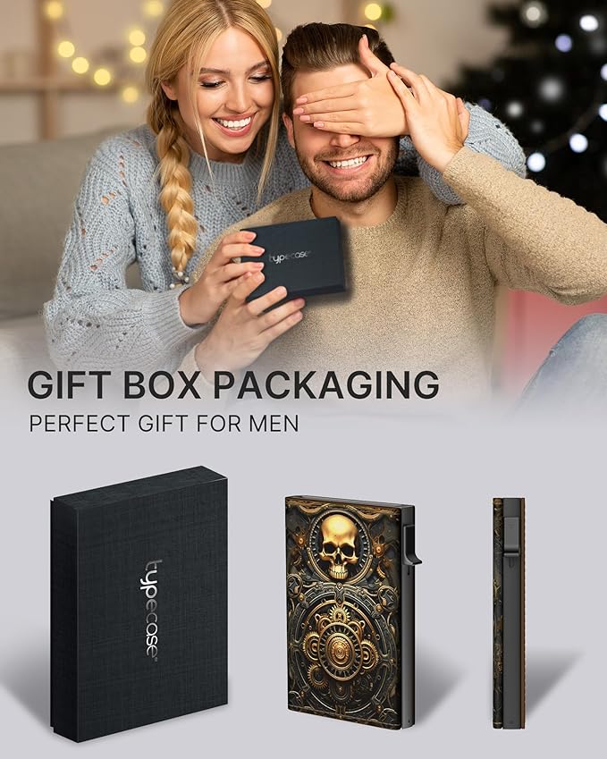 typecase Mens Wallet Card Holder: Pop Up Aluminum Case, Carbon Fiber Leather, Smart, RFID Blocking, Slim, Minimalist, Front Pocket - 9-14 Card Capacity | ID Window | Cash Slot (Skull)