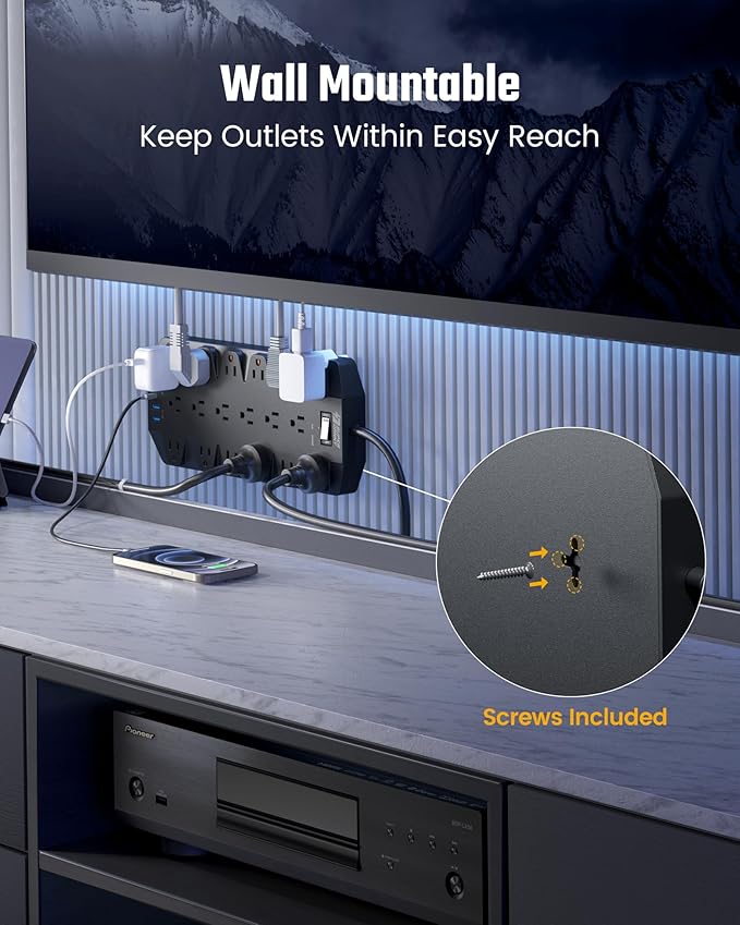 - 【Mountable and Flat Plug】The extension cord with multiple outlets back with 2 T-shaped mounting holes, package includes 4 screws and 1 drilling template for horizontal or vertical wall installation, preventing cord entanglement and overheating.And the 45°angled flat plug fits perfectly in narrow spaces like behind a bookshelf, nightstand, or the TV, and does not cover the bottom receptacle of a duplex outlet.