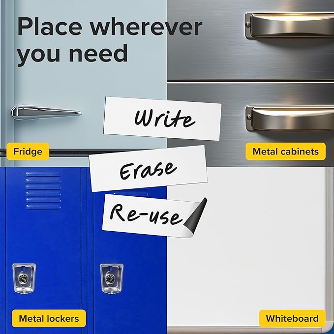 - ā EASY TO CUT, INSTALL and REUSABLE writable magnetic accents stickers. Write on them with a dry erase marker, wipe them off and use them again. Dry erase magnetic tape use for labeling storage shelves, labeling cabinets, whiteboards, magnet labels on the refrigerator, toolboxes, teaching aids, message boards, stockroom shelf labels, menu boards, planning boards, file cabinets, refrigerators, retail signs, and every other magnetic surface