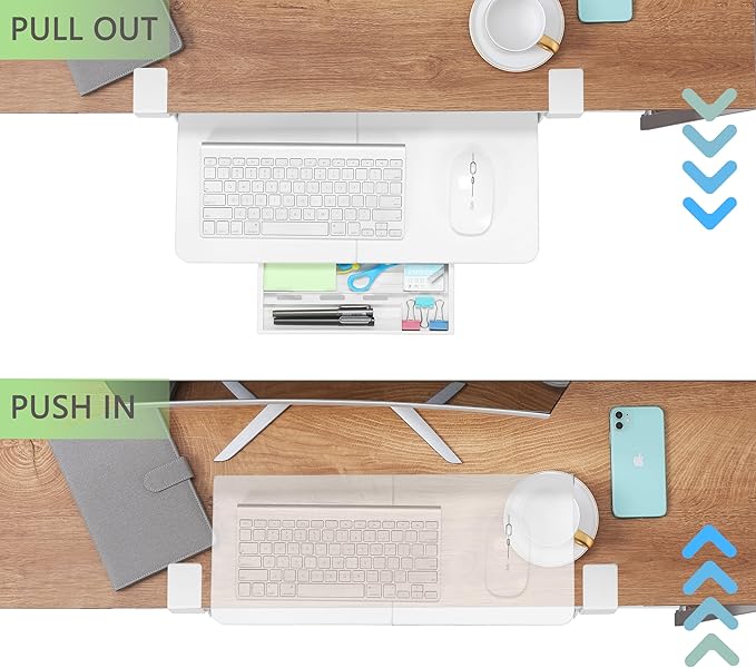 - [SLIDING TRAY] The retractable smooth sliding rail design allows the desk drawer to glide smoothly forward and backward. It encourages you to keep your arms and wrists in a neutral position and aids in the prevention of injuries caused by poor posture. Simply slide the tray under your desk when not in use and quickly pull it out when you need more space.