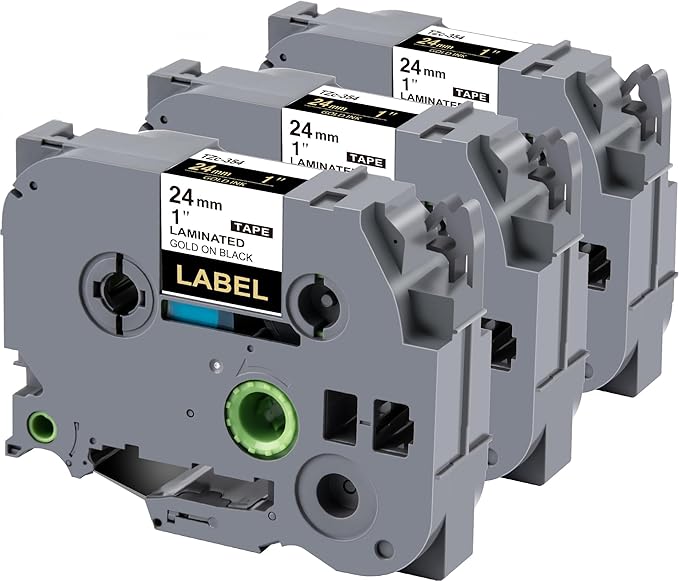 - Quantity/Size/Colour: TZe354 TZ-354 TZ354 TZe-354 Label Tape comes in packs of 3, is 1" (24mm) wide and 26.2 ft (8m) long and is gold on black