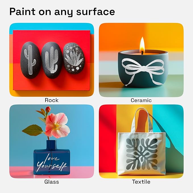 - PREMIUM QUALITY: This silver-pack of paint pens features high-quality acrylic paint that dries opaque, so you donβt have to make a second layer! The ink in the paint markers for canvas is water-based and features a durable nib.