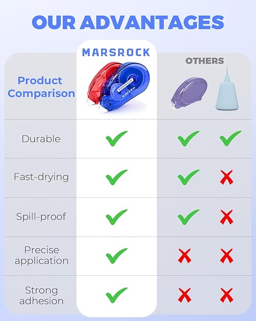 - Fast-drying & Strong Adhesion: Unlike traditional glue, MARSROCK dries quickly without spills or wrinkling, keeping your projects neat and professional. Its acid-free formula prevents photos from yellowing over time, ensuring lasting vibrancy. With superior adhesive strength, MARSROCK outperforms other tape glues, offering smooth and precise application for scrapbooking, crafts, and more. Reliable and easy to use, it delivers a flawless finish, making it the ideal choice for quality and durability in adhesive tools