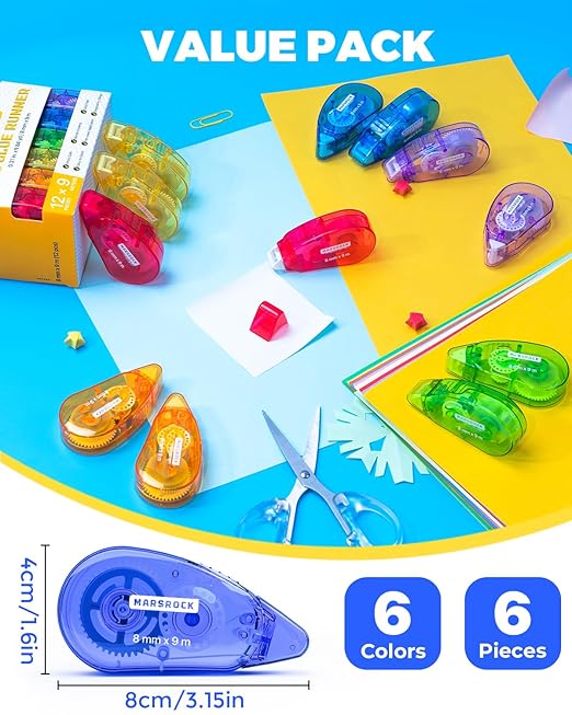 - Scrapbook Supplies: This double sided tape roller set includes 12 rolls of vibrant, scrapbook tape, each measuring 8MM in width and totaling 4251 inches in length, providing exceptional value for your DIY projects. With its colorful design, this glue tape not only serves as an effective scrapbook adhesive but also enhances your scrapbooking supplies with a touch of style. Whether you're looking for scrapbook supplies or versatile scrapbooking supplies, this high-value pack offers both functionality and aesthetic appeal