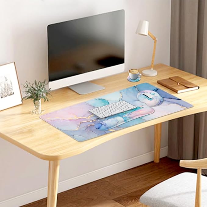 4-in-1 Gaming Mouse Pad Wrist Support Set,Desk Pad + Mouse Pad with Wrist Rest + Keyboard Wrist Rest + Coaster, Ergonomic Design for Home Office Study Game - Blue Marble