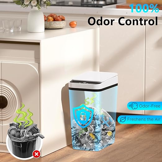 - 【Waterproof and durable】Crafted from high-quality ABS materials and equipped with IPX5 waterproof technology, this 2.6-gallon automatic trash can is resistant to water and humidity, guaranteeing trash can for bathroom long-lasting and clean use.