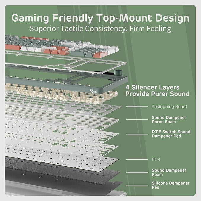- Sound Absorbing Foams - Equipped with IXPE switch dampener pad, 2 layers of thicker sound-absorbing foams, silicone dampener pad, which reduces 40% noise and removes 80% hallow sound. Bringing creamy or thocky sounding, natural and clear feedback, no more cavities noise.