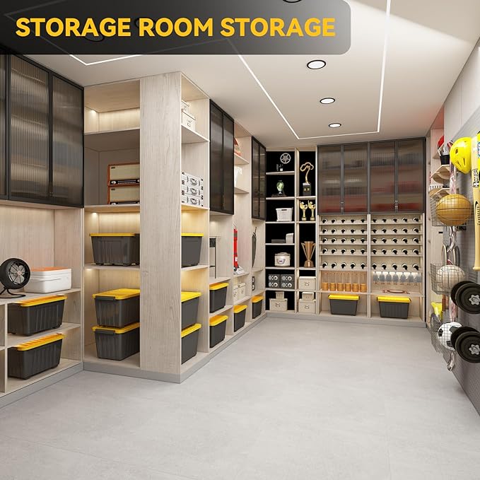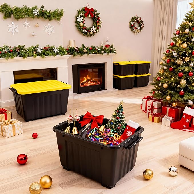 Nazhura 97 Quart Plastic Storage Bin, Stackable and Nestable Storage Boxes with Yellow Lids and Secure Latching Buckles, Large Storage Container (Black/Yellow, 97Quart-6Pack)