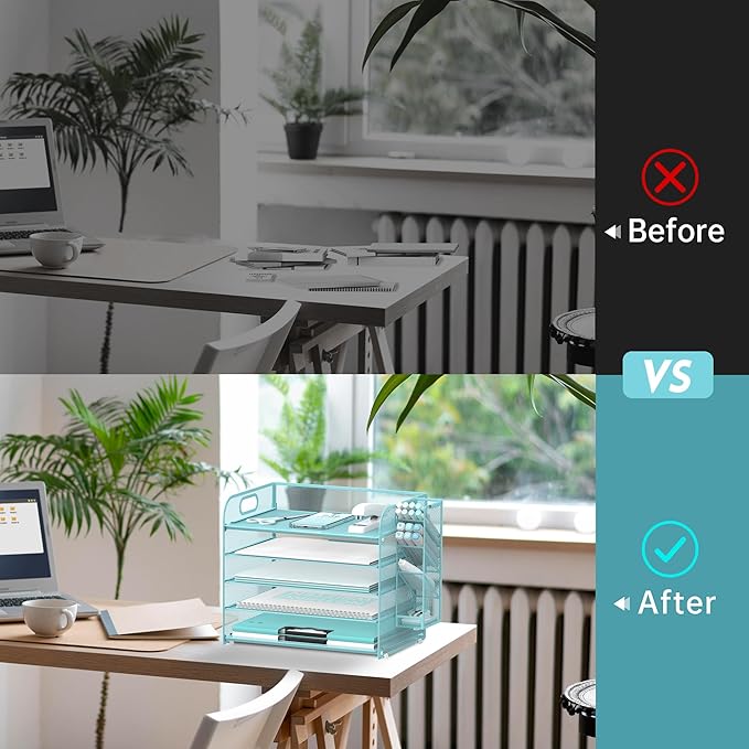 - [5 Tier Large Capacity] Upgraded SUPEASY blue desk organizer is 4+1 tier paper tray organizer. This paper organizer has 4 detachable trays which is perfect for holding letters, A4 paper, books, bills, magazines, mails, folders, notebooks and so on. The desk organizers can fully take advantage of your vertical space and keep your desktop clear and tidy.