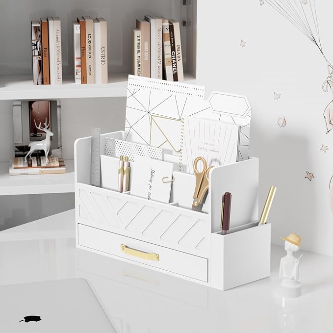 - Stylish office desk organizer: Upgrade your workspace with this stylish desk organizer, enhanced with gold mental drawers perfect for desk organization and file storage, With its sleek design for all your desk accessories, this desktop organizer is not only functional but also adds a touch of sophistication to any home office or work desk.
