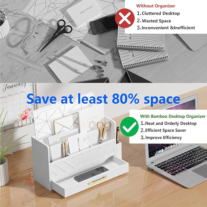 Bamboo Desk Organizer Mail Holder Countertop Wood Desk Drawer Tabletop Storage Box Pen Holder Letter Sorter Makeup Organizer for School Home Office Supplies with Pen Holder White