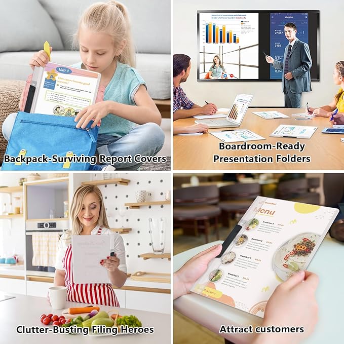 - Multi-purpose folder:Deployed in schools, corporate offices, medical facilities, homes, and retail spaces – these versatile folders streamline workflows by organizing reports for quick access, cut clutter as home filing heroes, and even shine as travel agency brochure holders or diner menu covers. One solution, infinite possibilities.