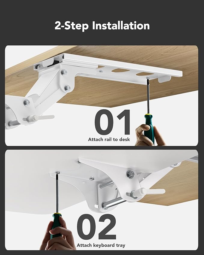 - Easy Installation - All necessary hardware and instructions are provided for assembly. Please confirm your table before buying (Minimum Depth >21.26", Minimum Width >35.4", Desk Thickness >0.6"); This Keyboard tray can be mounted on solid wood, particleboard, density board and MDF board; Make sure there are no barriers under your desk before purchasing, such as beams or table leg.