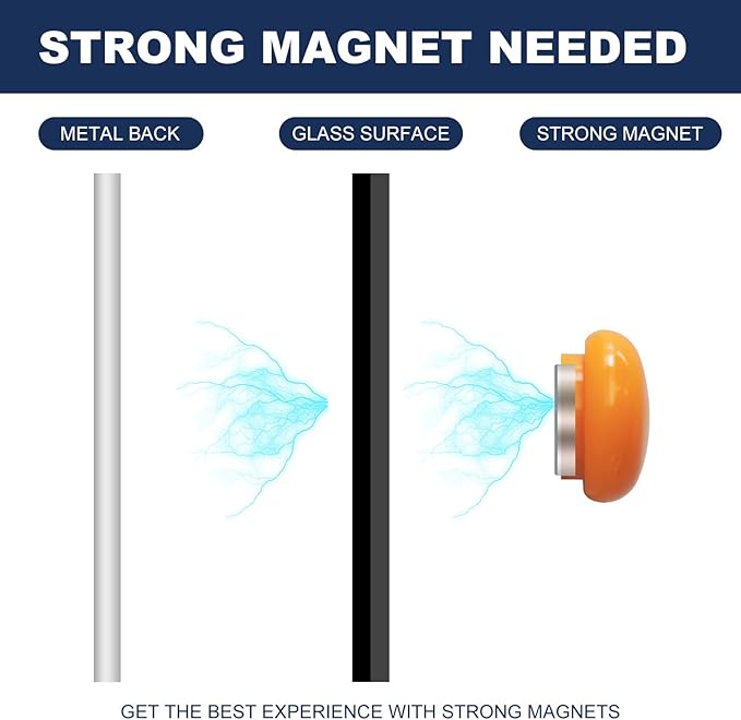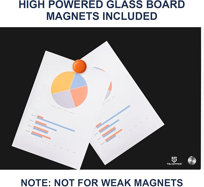 - MAGNETIC GLASS WHITEBOARD - Our glass white board comes with a multifunctional steel-backed magnetic glass and 4 high-power glass board magnets. Making this glass whiteboard perfect for meetings and presentations. (NOTE: The magnetism will not be strong due to the thickness of the glass, standard magnets do not work. The eraser is not magnetic.)