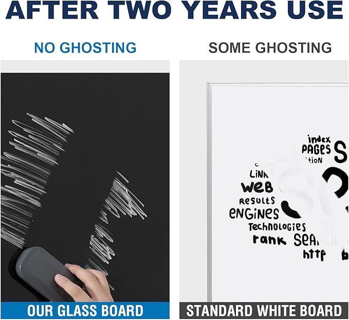 - PREMIUM GLASS WHITEBOARD - 48 x 32 inches glass whiteboard comes with smooth, strong and durable tempered glass surface, which is resists scratches and dents. This premium glass allows you to write, erase and rewrite on a clean surface every time.