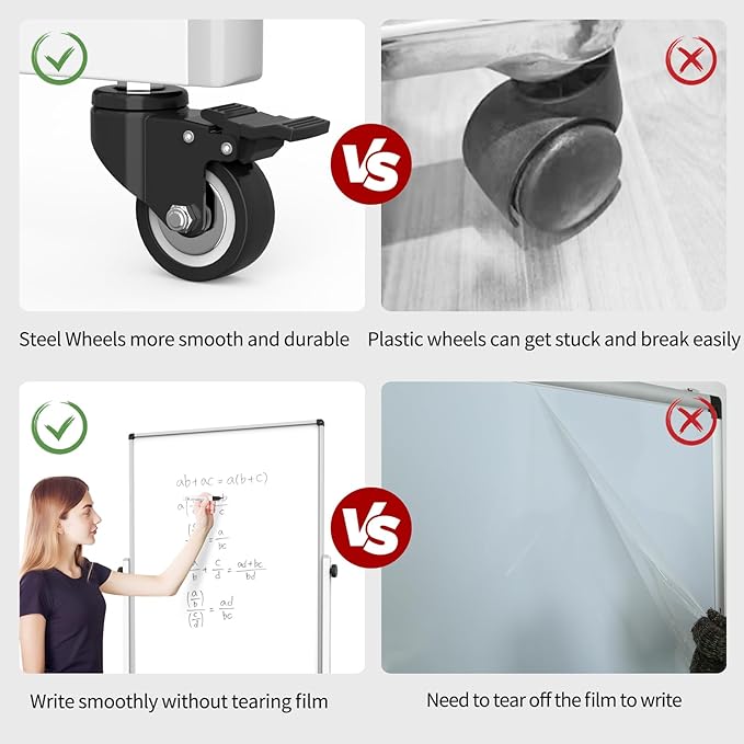 - Robust and Mobile: Built with a sturdy aluminum frame and four steel casters, our whiteboard ensures smooth 360° rotation and easy mobility. Engage the brakes for added stability during use.