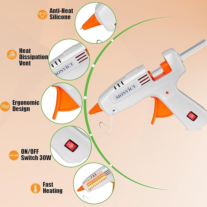 - ✅【Super-Fast Preheating & On/Off Switch 】: The glue gun uses a more advanced PTC heating system and is equipped with a 30W heating chip, it can be preheated faster within 1-2 mins. It’s easy to toggle the On/Off switch so that you don't need to unplug them every time you want to turn them off, and the LED indicator light lets you know that the tool is heating up.