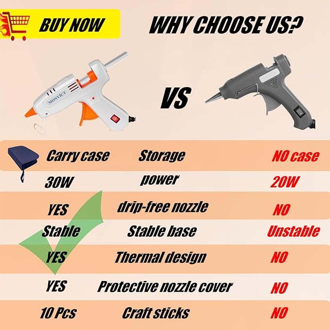 - ✅【 Anti-drip & Simple Operation】:The longer anti-drip nozzle allows you to be more precise when it comes to hot gluing something. Just insert a diameter of 7mm glue stick, connect it to the power supply, and turn on the switch to heat for 1-2 minutes. Gently pull the trigger to squeeze out the glue.