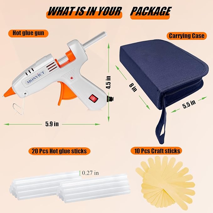 MONVICT Hot Glue Gun Kit, Mini Glue Gun with Carrying Case,20 Pcs Premium Glue Sticks, 10 Pcs Wood Craft sticks, Fast Preheating Hot Melt Glue Gun for School Crafts DIY Arts Gift (White, 30Watts)