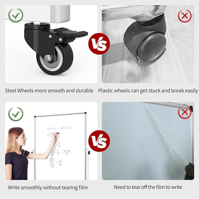 - EASY TO WRITE AND CLEAN: Crafted from high-quality materials, our mobile whiteboard ensures smooth writing and effortless wiping. Its surface enables the attachment of additional charts, photos, and documents for enhanced versatility.