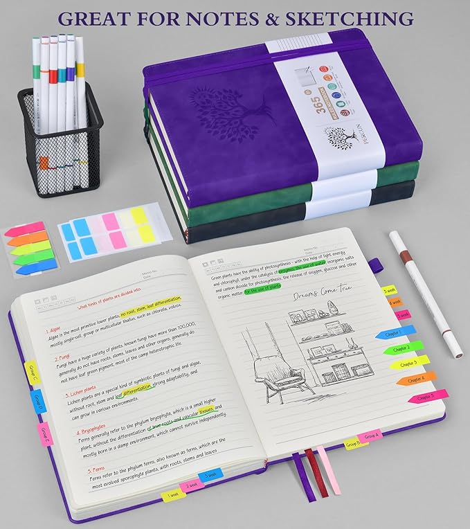 - 【180°Lay Flat for Writing】Our notebook also comes with 180°Lay Flat Journal Notebook, which makes writing a breeze. The elastic pen holder and bookmark ensure that you never lose track of your pen, and the 2 elastic closures ensure that your journal stays securely closed. The 3 colored ribbon bookmarks and 3 sticky labels provide even more ways to customize your journal to your liking.Built-in back pocket that is great for storing loose notes, cards, or other important items.