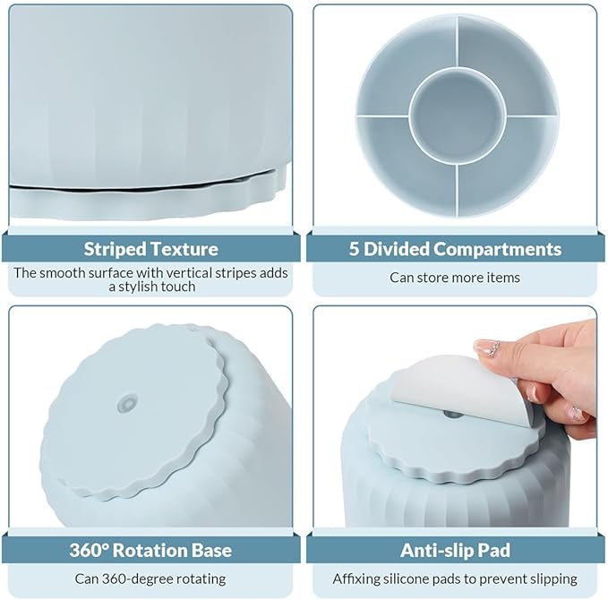 - Space-Saving: The design of 5 compartments can be reasonably divided into storage areas. This 4.8*3.2 inch desk organizer can be placed anywhere in the office, vanity, bathroom, bedroom, and living room