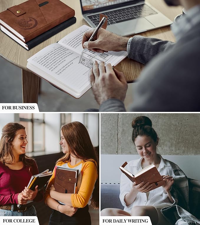 - 【LINED JOURNAL NOTEBOOK】: Our A5 lined notebook journal (5.9in x 8.4in) , featuring a brass button close design, is perfect for both men and women.Its leather cover pocket can be used to store notes, receipts or cards. The medium sized notebook is designed for study, journals for writing, note taking and travel.