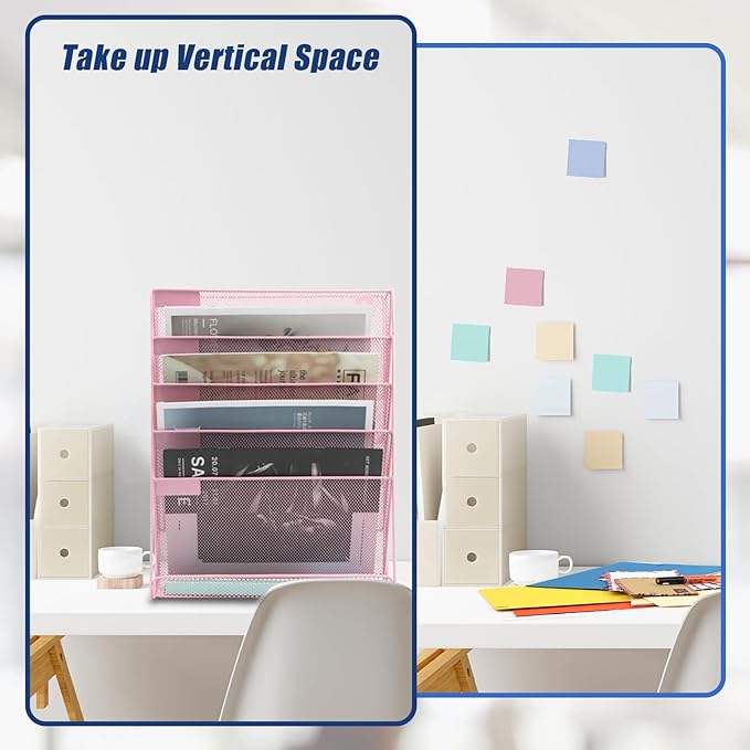 EASEPRES Desk File Organizer Mesh 6-Tier, Hanging Wall Mount Document Organization Stand, Desktop Vertical Mail Paper Folder Holder Rack with Bottom Tray for Office Home Cubicle Countertop, Pink
