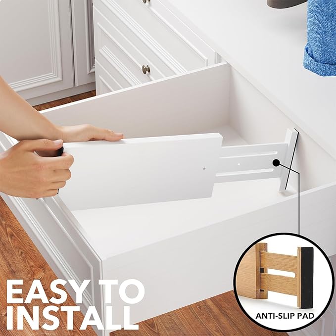 - Drawer Dividers That Stay in Place: Strong spring-loaded design makes them sturdy dividers, with non-slip rubber pads in the end, keeping it stay put all the time and protect your drawers from scratches