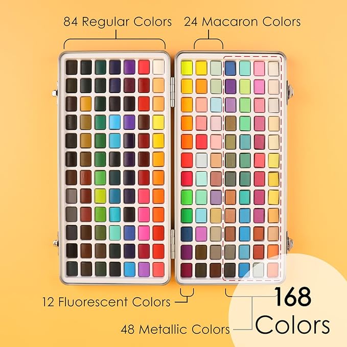 - Multicolor Watercolor Set: includes 84 regular colors, 48 metallic colors, 12 fluorescent colors, and 24 macaron colors, totaling 168 colors. Using high-quality pigments, apply smoothly and evenly. Suitable for various purposes such as design, still life painting, and artists of all levels.