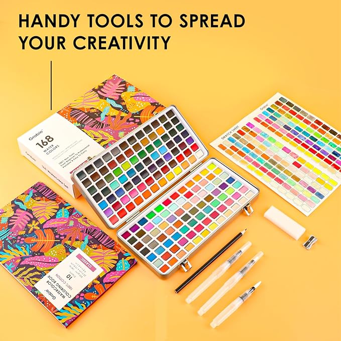 - Grabie 168 Color Watercolor Set: Contains 168 vibrant colors and convenient tools, suitable for all painting levels, inspiring creativity.