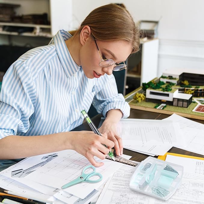 - Green Suit: mini office supply kit includes 1 mini stapler, 1 sharpener, 1 tape dispenser, 1 scissor, 1 staple remover, 500 pieces of staples, 20 pieces of paper clips, 5 pieces of pens, 1 fluorescent pen, 12 pieces of long tailed clips, 1 note, 1 small telescopic knife and 1 box; A set of packaging can meet your various office and study needs and save your matching time