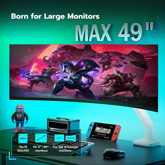 - 【Support up to 49" & 44lbs Monitors】The monitor desk mount supports most flat, and curved computer screens ranging from 17 to 49 inches, holding 4.4 to 44 lbs. Compatible with Samsung Odyssey G9, LG, and other 49" ultrawide monitors(not for tv) which with VESA mount adapter and equipped with 75x75mm and 100x100mm VESA mounting holes.