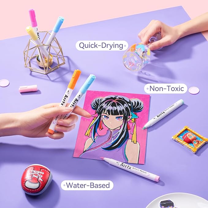 - Quik Dry and Waterproof : The highly pigmented paint is high covering, water-resistant, and abrasion proof allowing the application to any surface. Arrtx acrylic paint pens are water-based ink. These paint markers flow without flooding or jamming, it's permanent when dry. Note: Please tighten the cap and put pens horizontally if you don't use them.