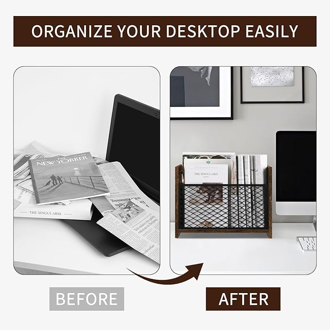 - Space Saving: Our magazine file holder sizes are about 14.09"LĂ7.48"WĂ10.43"H. Perfect size for a relatively small living room area. Rustic magazine rack helps reduce magazine clutter and keeps them all in one place. It looks great in your living room and keeps your floor or desktop organized.