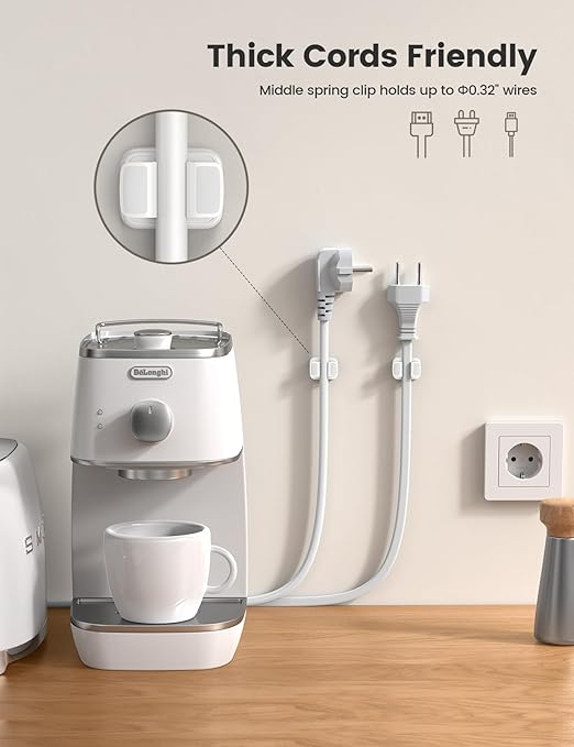 - Hold Various Cords: The extension length of the middle spring clip is 2.5-8mm (0.1-0.32inch), this desk cord holder spring clip can be applied to almost all the household cables, including iPhone charger cables, USB cords, HDMI thick cables,computer power cords, ethernet cable, etc. The both sides hole clip supply to the small cable which diameter is 3mm-5mm.